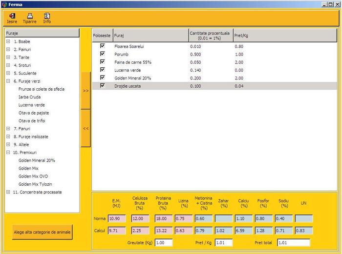 Avantajele utilizării programului pentru calculul raţiilor furajere bazată pe normele specifice fiecărei rase şi categorii de vârstă: - Calculează necesarul optim al furajelor în funcţie de specie, vârstă şi categorie de animal - Alegerea furajelor dintr-o bază completă de furaje utilizate în hrănirea animalelor disponibile pe piaţa românească - Animale frumoase şi rezistente la boli - Reduce mortalitatea datorată nutriţiei necorespunzătoare - Mai puţine dereglări ale metabolismului - Reduce consumul specific - Măreşte producţiile animale - Cantitate de hrană asimilată creşte - Carne în carcasă mai multă - Combinarea optimă a furajelor generează costuri reduse - Venituri mai mari pentru crescătorii de animale - Crearea unui PH neutru în stomac folosind premix-urile în alimentaţie (Atenţie: nu întocmiţi raţiile fără aport de premix.)